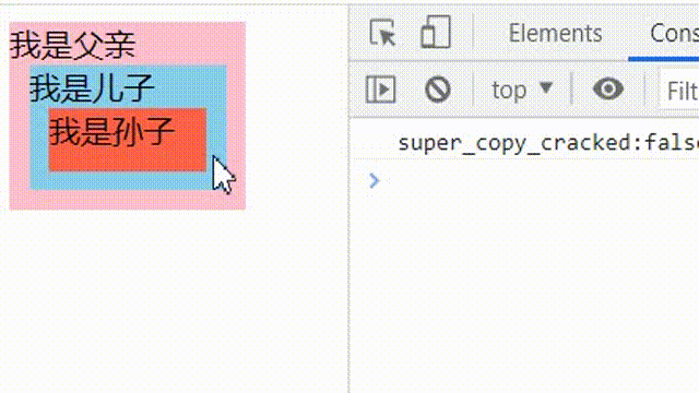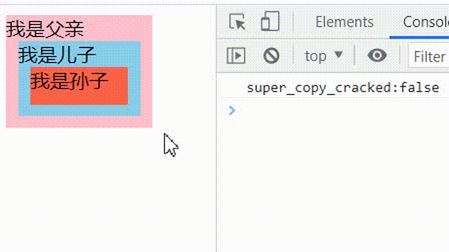 当我们点击 “我是孙子” 时,页面上会依次输出:我是孙子、我是儿子、我是父亲。在事件冒泡中 “我是孙子” 是最先点击的,所以也就最先触发了,然后在沿着 DOM 树向上层节点依次传递事件。然后就输出了刚刚的效果。